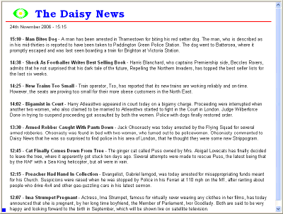 Look at the simple page of Daisy News that has been mocked up below. Any relevance to any real people or companies is totally an accident! This type of site could easily be setup by any news organisation from the BBC, The Times, The Telegraph or any of many reputable news sources. In this example, there is only one page, but it would be very easy to have say several pages, with perhaps one for news, one for sport and one for business. Each would be given say twenty seconds and everything would be controlled by a script file. Note the blue control panel in the bottom left. In a real application, this could be set to a colour that hid it completely. Why shouldn't the web pages be interspersed with advertising? All it would need would be to mix the pages with an appropriate call to a server that would display an advert and create a charge for the client. ![]() Imagine a system such as this in your local coffee shop! |